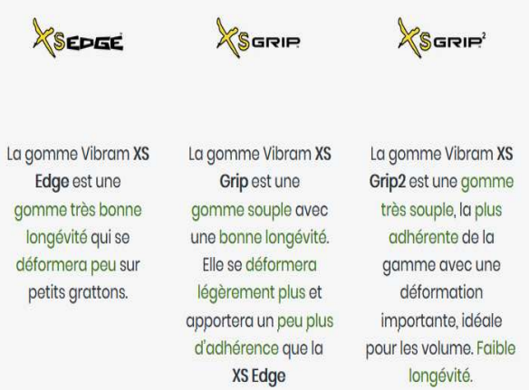 Gommes polyvalentes : Elles offrent un compromis équilibré entre adhérence et durabilité. Idéales pour les grimpeurs qui pratiquent sur différents types de rochers et cherchent une solution économique. Exemples : Vibram XS Grip, Five Ten C4.
